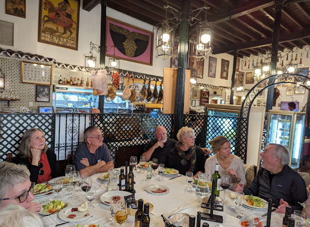 A walk (after lunch where we were allowed to sit down and drink) still on Saturday, to the Cathedral and Giralda. The Cathedral was huge and elaborately decorated - it still seemed less intimidating than others we've seen. Phil went on to the Jewish Quarter while I ducked out after 5pm. We are walking to dinner and at the point I left we were just under six miles today - so with the evening meal walk I think we will make it firmly past six. Some folks just arrived yesterday and this kind of "touring" was challenging, so we lost about a quarter of the group by the time I left. Tongiht we have dinner scheduled together and then Sunday lunch is our last group meal. We switch to independent travel for the next six weeks (except for two out of town trips). Thank God - as we always said in my family "she's done being friendly." (At the time we were referring to my grandmother but some DNA managed to make it at least three generations. I got the travel gene from my Grandfather so you take the good and bad as they come. )